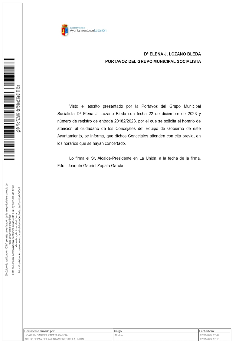 Desde el PSOE de La Unión hemos preguntado concretamente cuál es horario de estos concejales liberados a tiempo parcial y cuándo cumplen esas 15,75 horas semanales que deben trabajar. La respuesta ante tan simple pregunta, ante una pregunta que cualquier trabajador podría responder sin problema, ha sido que ellos solo trabajan con cita previa.