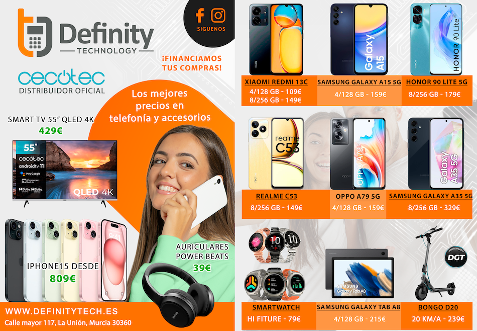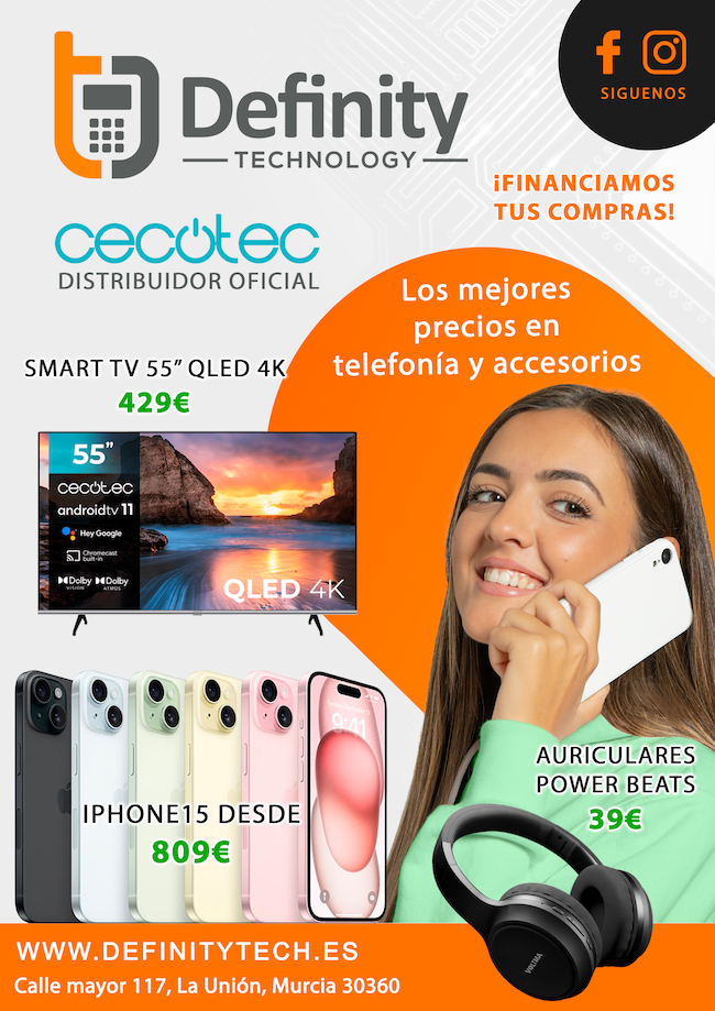 Puedes comprobarlo a través de www.definitytech.es o acudiendo a nuestra tienda física sita en el número 117 de la calle Mayor de La Unión. Somos móviles y mucho más productos con ofertas insuperables.