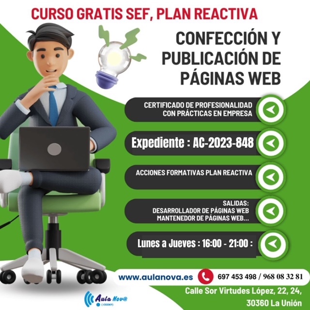 Lanzamos el curso de confección y publicación de páginas Web. Desde Aula Nov@ C.E.E.N.P, S.L., ubicados en La Unión, queremos presentarte una oportunidad formativa que puede potenciar tu carrera profesional.