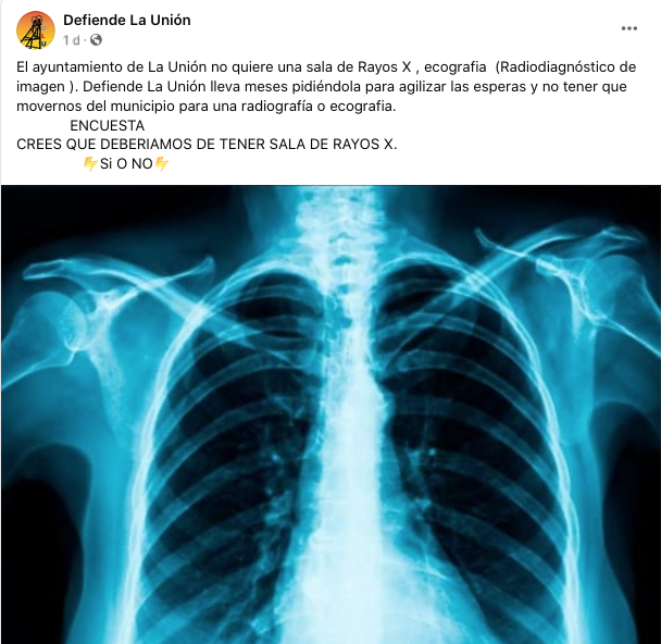 Es la pregunta con la que Defiende La Unión lanza una encuesta a través de su perfil de Facebook, pidiendo a los internautas que se pronuncien. "El Ayuntamiento de La Unión no quiere una sala de radiodiagnóstico de imagen y DLU lleva meses pidiéndola para agilizar las esperas y no tener que salir del municipio. SÍ o NO, ¿que opinas?