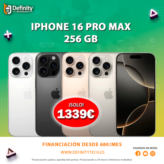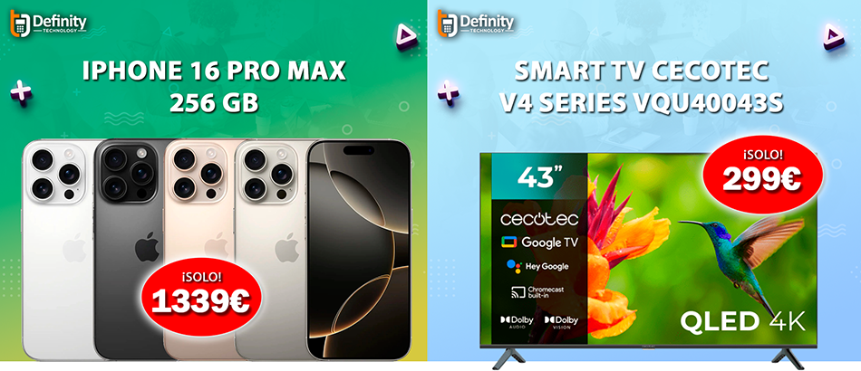 Móviles Iphone 16 Pro Max 256 GB por sólo 1339 euros con financiación de 68 euros al mes y un televisor de 43 pulgadas Smart TV Cecotec V4 Series VQU40043S por sólo 299 euros.