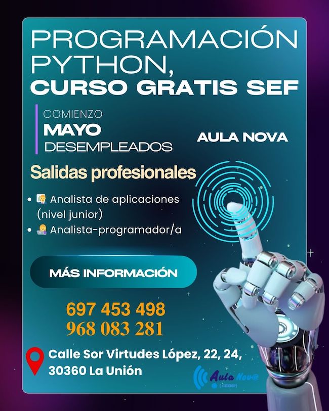 Desde Aula Nova queremos compartir contigo una acción formativa que puede marcar un antes y un después en tu camino profesional: 'Programación Python'. Forma parte de tu itinerario formativo-profesional, ampliando tus competencias y mejorando tus oportunidades de inserción laboral.