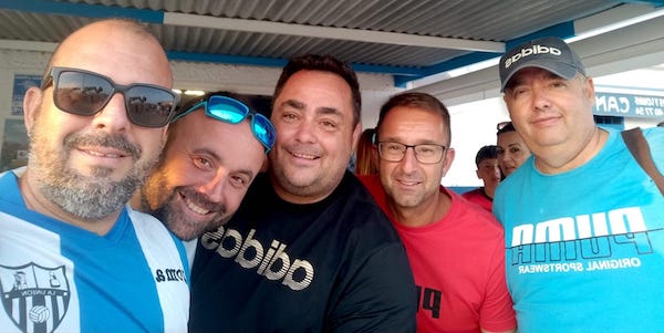 Sebas Andreu (cantaor flamenco), Jesús (empresario), Daniel Cano (concejal de DLU), Sergio (gran aficionado al fútbol) y José Cano (presidente de DLU), de izquierda a derecha del lector