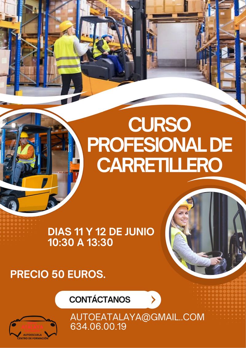 Autoescuela Atalaya, en su área de formación laboral, organiza un curso para las mañanas del 11 y 12 de junio para aprender bien el uso y conducción de carretillas elevadoras.
