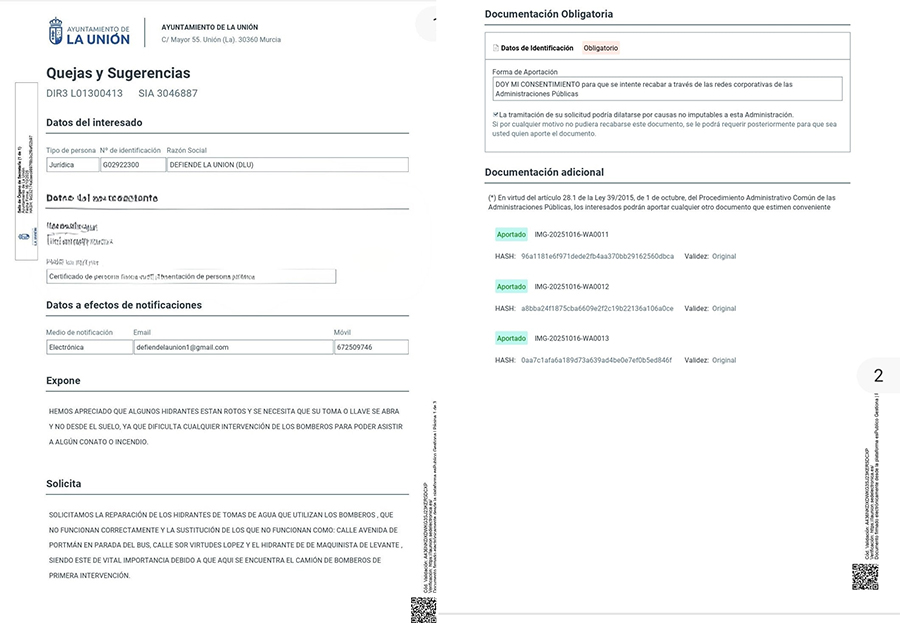 Desde Defiende La Unión se indica que esta semana hemos podido apreciar que algunos de los hidrantes en La Unión no funcionan bien, y se necesita que la llave o toma se pueda conectar al camión de bomberos para cargar agua y la mayoría de ellos no van o no funcionan correctamente, lo que ocasiona que el tiempo de respuesta sea mayor y se tenga que desplazar el camión a otros lugares para coger agua.