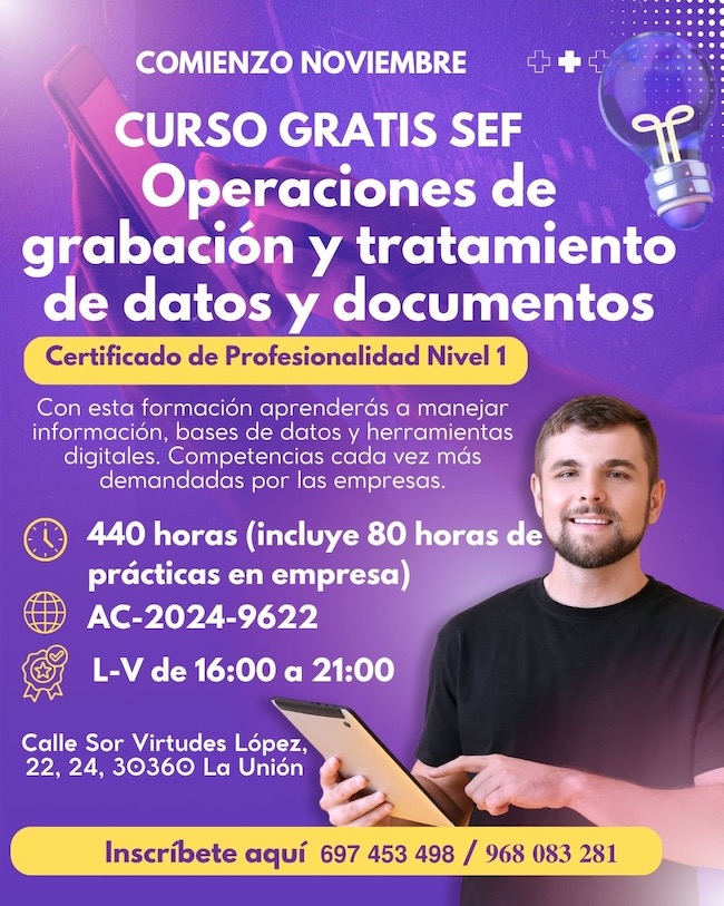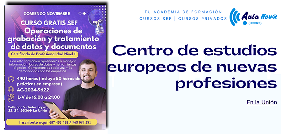 Hoy más que nunca, la formación es la llave que abre las puertas del empleo. Por eso, desde Aula Nova te ofrecemos una oportunidad única para crecer profesionalmente y mejorar tus opciones laborales. Certificado de Profesionalidad (Nivel 1): 'Operaciones de Grabación y Tratamiento de Datos y documentos'.