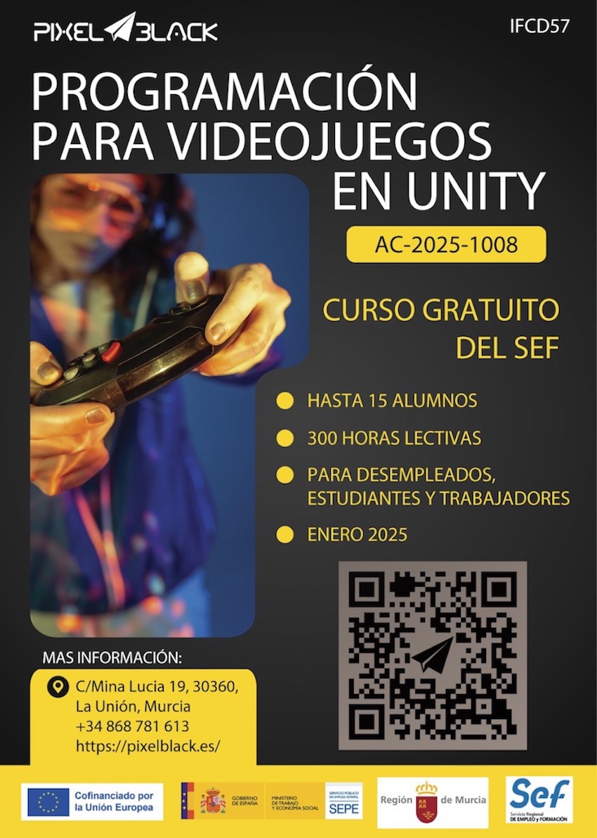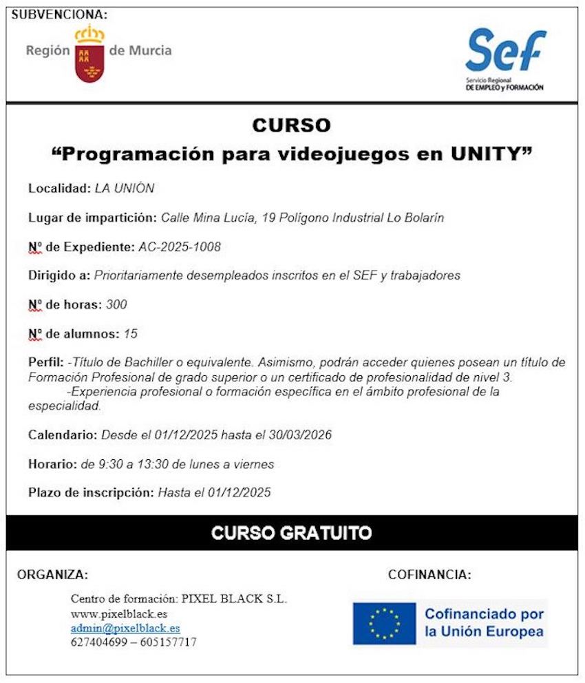 El centro de formación sito en el polígono industrial de Lo Bolarín lanza dos nuevos cursos gratuitos para desempleados, estudiantes y trabajadores, en general. Uno es 'Inteligencia artificial aplicada a la industria' y otro es 'Programación para videojuegos en Unity'. Ambos fija el tope de alumnos en 15, por lo que no debes tardar en apuntarte para asegurar plaza.