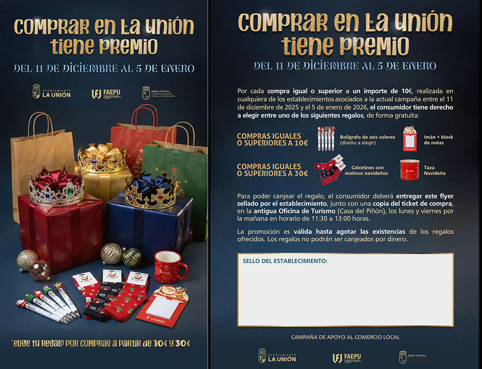 Esta semana culmina la campaña 'Comprar en La Unión tiene premio' que se puso en marcha el pasado 11 de diciembre y por la que las compras por importes iguales o superiores a 10 y 30 euros tienen obsequio, los cuales se recogen, con el tique de compra, en la planta baja dela Casa del Piñón, donde se encuentra el belén municipal. Varios de los productos se han agotado, lo que refleja la buena aceptación que está teniendo esta iniciativa.