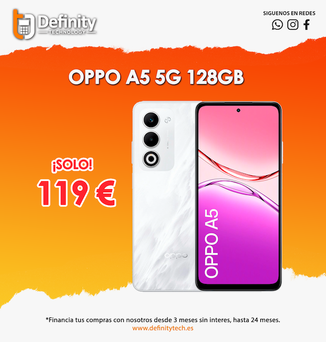 Así es con Definity Technology. En esta ocasión, entre las promociones que lanzamos destacamos la gran oportunidad de conseguir un terminal móvil ‘Oppo A5 5G 128GB’ por sólo 119 euros. Además, puedes financiar su compra sin intereses desde 119 euros.
