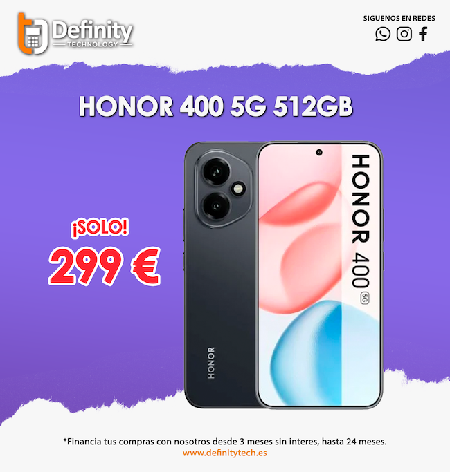 El terminal móvil HONOR 400 5G, con memoria interna de 512 GB, memoria RAM de 8GB y pantalla de 6,55 pulgadas, lo tienes al mejor precio del mercado actual en tu establecimiento de la calle Mayor de La Unión y a través del portal www.definitytech.es / Recuerda que también puedes pagarlo sin intereses entre 3 y 24 meses.