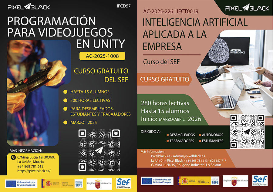 De la formación que adquieras depende tu futuro. 'Inteligencia Artificial aplicada a la empresa' y 'Programación para videojuegos en Unity' son los dos nuevos cursos que te ofrece el centro ubicado en el polígono industrial Lo Bolarín. Hacerlos no te cuesta un euro. Apúntate. Plazas limitadas.