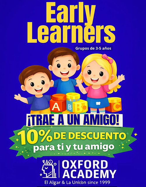 'Early Learners (3-5 años)'. Trae a un amigo y disfrutad los dos de un 𝟭𝟬 % de descuento. Para niños nuevos que vengan recomendados por un alumno de la academia o si se apuntan dos amigos nuevos. En Oxford Academy aprendemos Inglés jugando, cantando y explorando en un entorno seguro y motivador.