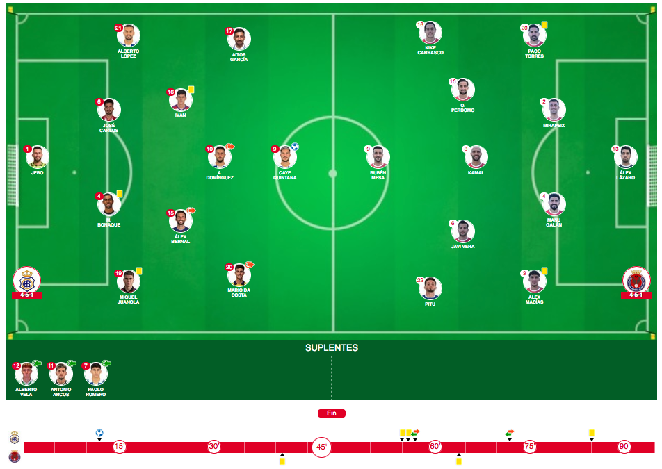 GOL. 1-0. Minuto 12: Jugada por la banda izquierda local concentro de Aitor García y mal despegue de la defensa, lo que aprovecha para marcar Cayetano Quintana, jugador que había sido homenajeado en los prolegómenos por alcanzar los 150 partidos (50 goles) con el club blanquiazul.