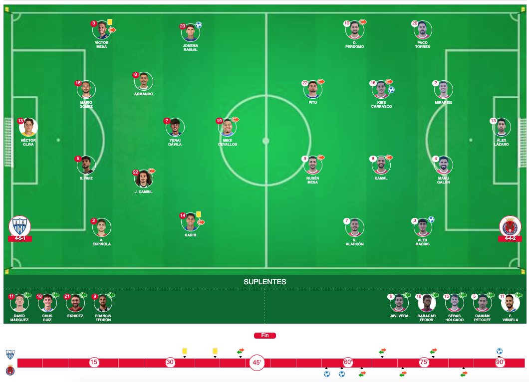GOLES. 0-1. Minuto 56: Álex Macías. 0-2. Minuto 59: Kike Carrasco. 1-2. Minuto 90: Raigal.