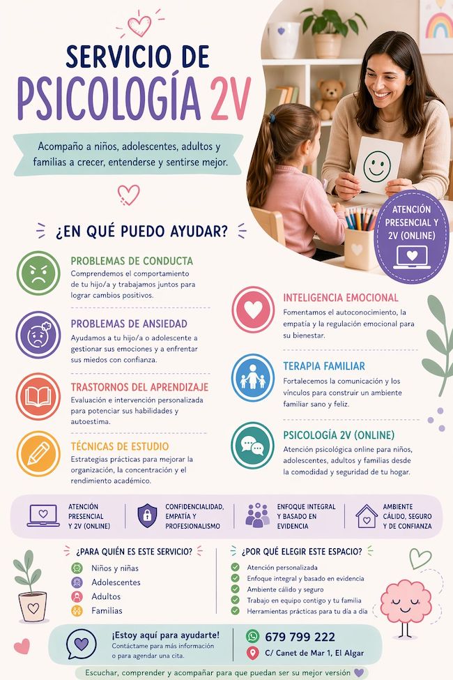 En Academia 2V, nuestra psicóloga es especialista en problemas de conducta, problemas de ansiedad, trastornos del aprendizaje, técnicas de estudio, inteligencia emocional y terapia familiar