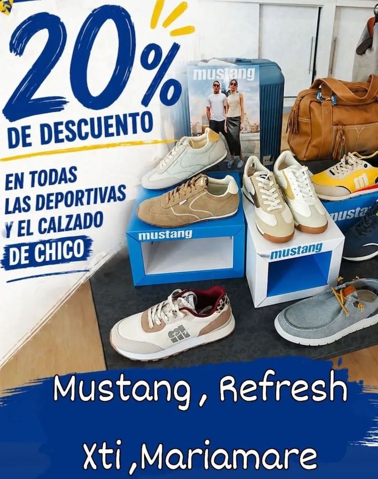El establecimiento de la calle Mayor aplica n 20% de descuento en todos los modelos de deportivas y en el calzado de chico de nueva colección. Calidad y comodidad a los mejores precios. Marcas como Mustang, Refresh, Xti, Mariamare. Promoción durante tiempo limitado. No pagues más por lo mismo. Visítanos sin compromiso.