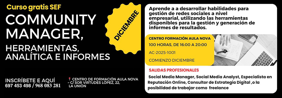 En Aula Nova, tu centro de formación de La Unión, abrimos inscripción para una formación del SEF (Servicio de Empleo y Formación de la Región de Murcia) pensada para impulsar tu perfil profesional.