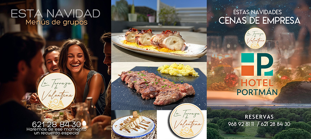 Estas navidades puedes elegir entre los menús que hemos preparado en 'La terraza de Valentina' y Hotel Portmán para grupos con una suculenta selección de nuestros platos a un precio irrepetible (35 y 42 euros). Además, bebidas ilimitadas hasta el postre. Somos el local hostelero del Hotel Portmán y donde más mimamos el sabor junto al Mediterráneo.