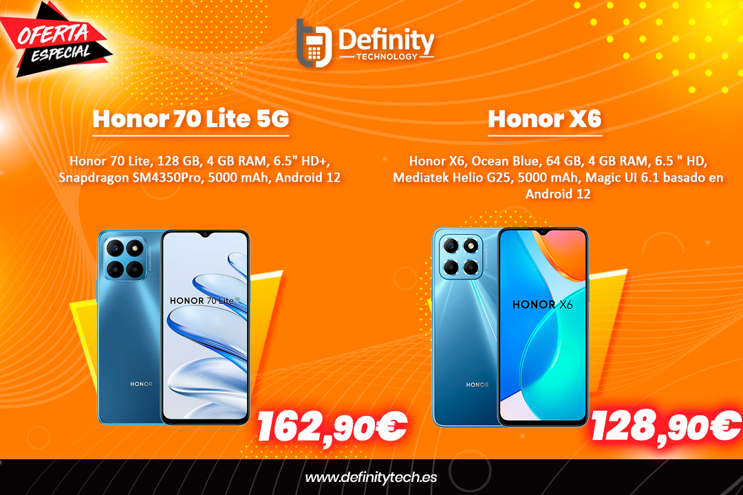 Definity Technology pone esta semana en promoción dos terminales estupendos Honor 70 Lite 5G y Honor X6, ambos con 4 GB RAM y pantallas de alta calidad de 6,5 pulgadas. No los encontrarás a mejor precio.