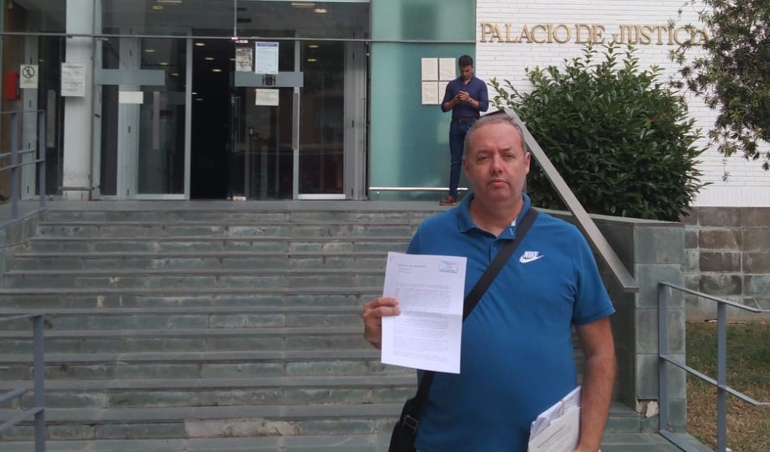 Defiende La Unión ha presentado ante la Fiscalía del Partido Judicial de Cartagena un escrito y un vídeo al estimar que pueden haberse producido "una irregularidad que podría considerarse grave, al llevar un camión leña al garaje de un alto cargo funcionariado", indican, añadiendo que han tomado esta decisión tras pedir explicaciones al Ayuntamiento y no recibir respuesta. En la imagen, el presidente del partido, José Javier Cano, ante la puerta del Palacio de Justicia.