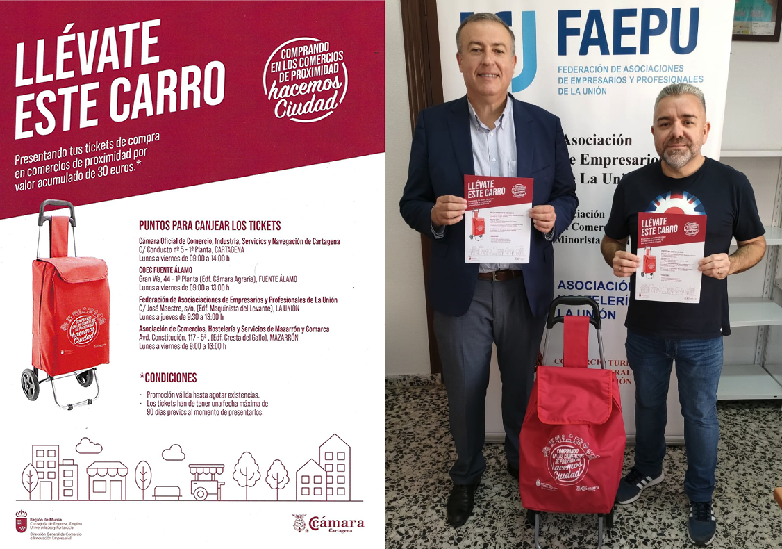 La Cámara de Comercio de Cartagena, en colaboración con FAEPU y con el patrocinio de la dirección general de Comercio e Innovación Empresdarial, ha diseñado una campaña para promocionar el comercio minorista, consistente en la entrega de un carro de compra a aquellos consumidores que lo justifiquen con tiques por compras iguales o superiores a 30 euros en el comercio de La Unión, con una fecha máxima de 90 días previos al momento de presentarlos en establecimientos comerciales de la localidad.