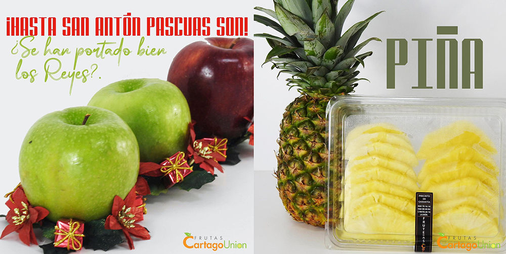 La manzana verde es rica en antioxidantes y la piña ayuda a depurar tu organismo. Encarga tu fruta, verdura, embutido y quesos, entre otros productos, en nuestros establecimientos ubicados en los números 88 y 118 de la calle Mayor de La Unión o llamando a Paqui al 968 08 68 86 o a Toñi al 868 78 16 18. También puedes venir directamente a por lo que necesites. ¡Estaremos encantados de atenderte!