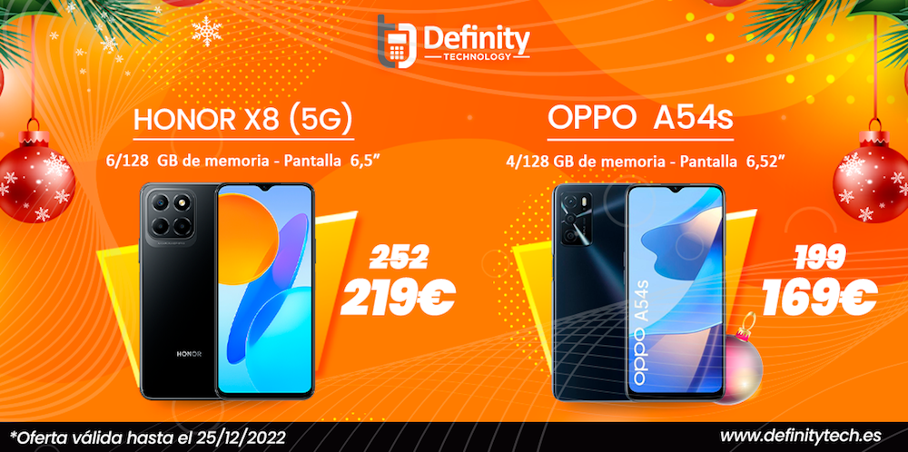 Un terminal móvil ‘Honor X8 (5G)’, con 6/128 GB de memoria y pantalla de 6,5”, por sólo 219 euros. Otro ‘Oppo A54s por 169 euros con 4/128 GB de memoria y pantalla de 6,52”. Los tienes en el establecimiento de la calle Mayor de La Unión y en www.definitytech.es