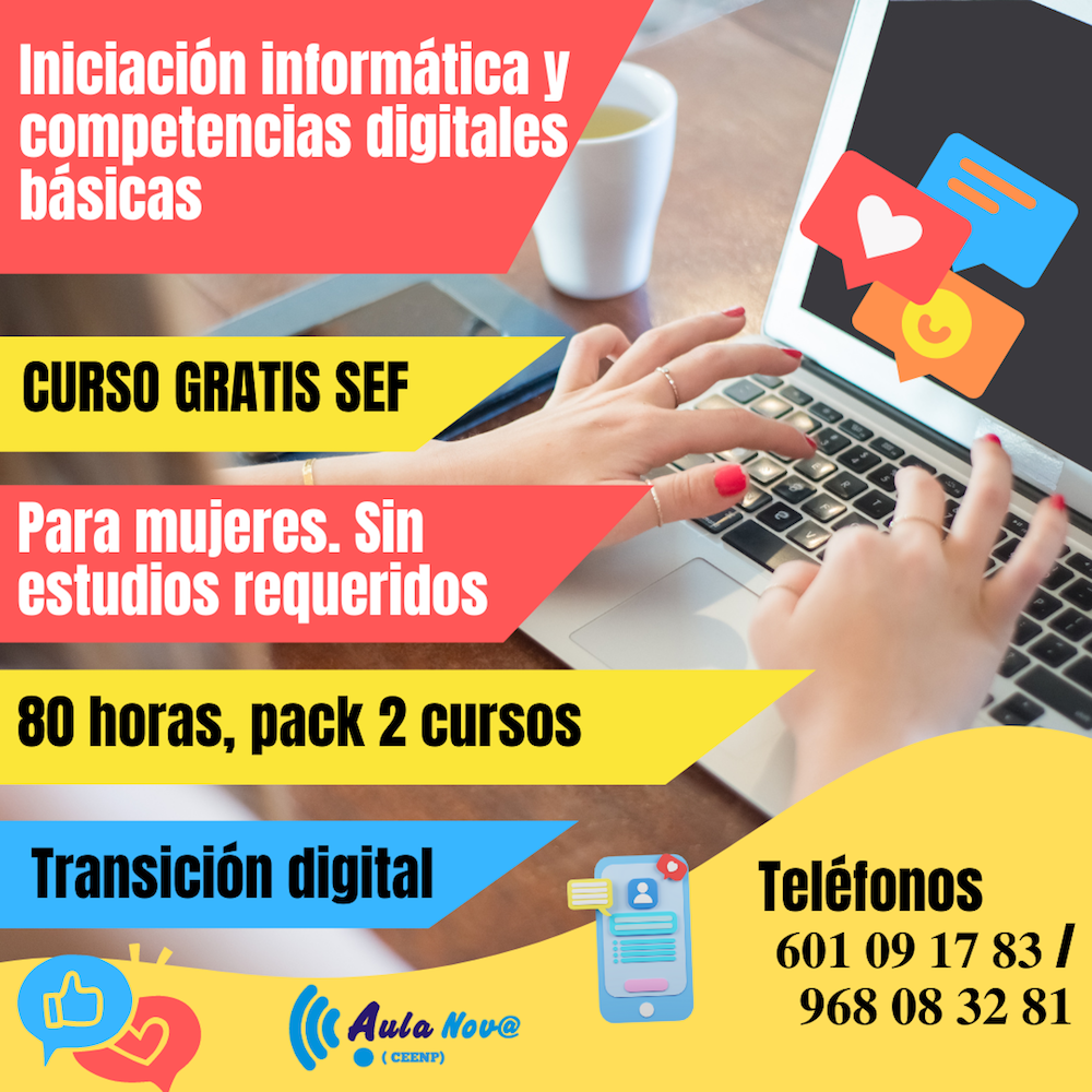 Buenos días a todas. ¿Cómo ha comenzado ‘el puente’?, esperemos que bien. Sin embargo, aunque hay que descansar hay que pensar también en el futuro profesional y hoy hacemos llamada a la población femenina que busca trabajo, pues os recordamos que este mes empieza el curso gratuito del SEF de ‘Iniciación a la informática y en competencias digitales básicas’. Es un curso para mujeres y no se requieren estudios para apuntarse. Es tu oportunidad de mejorar tus conocimientos y tu futuro profesional. El curso comenzará este mes y sólo tiene 10 plazas. No te confíes y apúntate ya en Aula Nova, tu academia de formación.