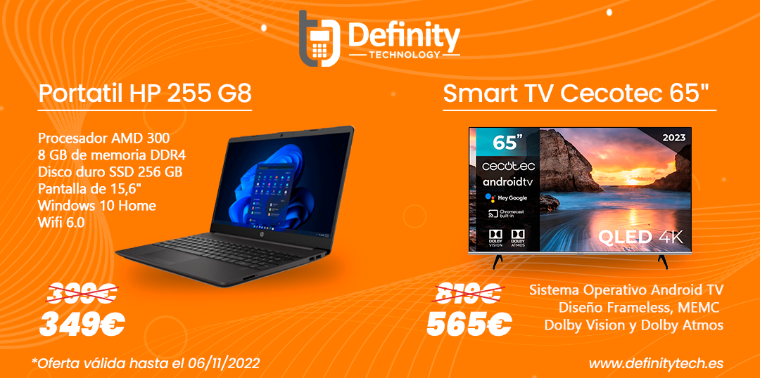 Un portátil HP 255 GB por sólo 349 euros tras reducir su precio en 50 euros y un televisor Smart TV Cecotec de 65 pulgadas por 565 euros, cuyo valor fuera de esta promoción es de 565 euros.