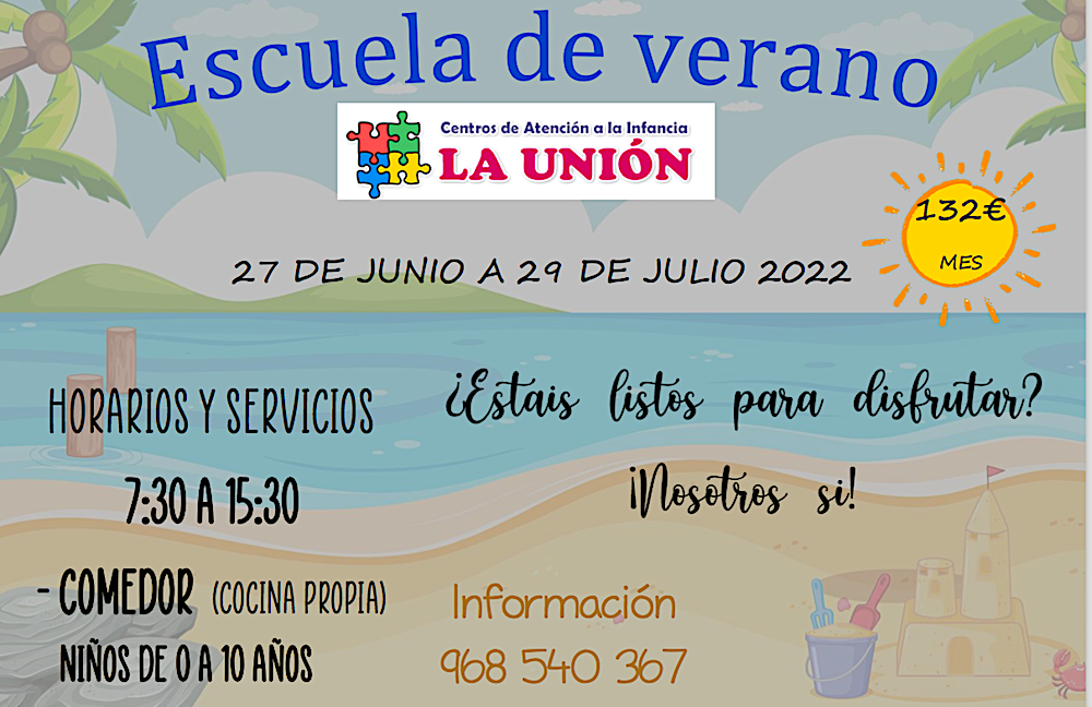 Dirigida a niños de hasta 10 años de edad. Comedor con cocina propia. Venir a disfrutar con nosotros a diario de 7.30 a 15.30 horas. ¿Quiéres saber más o te ha surgido alguna duda? Llámanos al teléfono 968 54 03 67. Estaremos encantados de responderte.