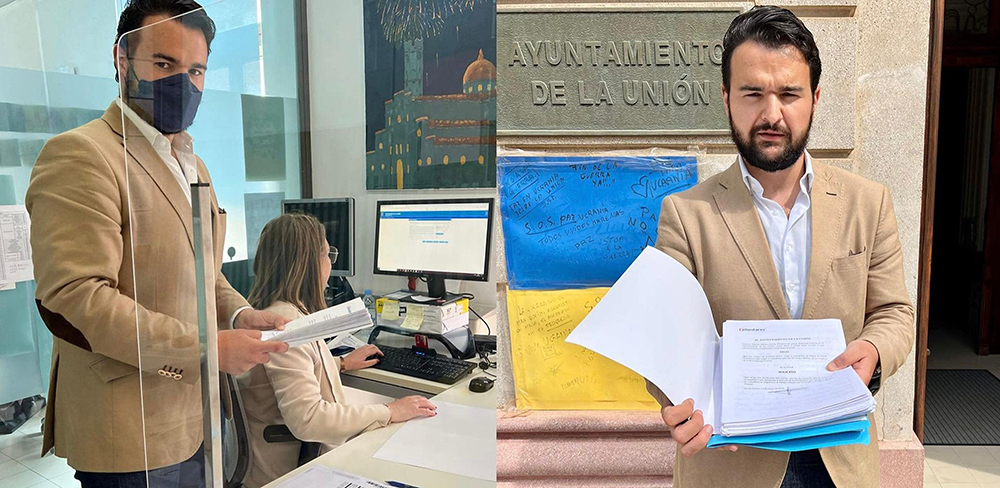 La campaña #SOSPARQUEMINERO, promovida por el Partido Popular de La Unión a lo largo de estas últimas semanas para exigirle al Ayuntamiento que proceda a la reapertura del Parque Minero y de la Mina Agrupa Vicenta, ha sido respaldada por 2.523 personas que han avalado con su firma "lo que ya se ha convertido en un clamor social en nuestra localidad". En la imagen, el portavoz del PP unionense, Joaquín Zapata, entrega en el registro municipal las firmas recogidas.