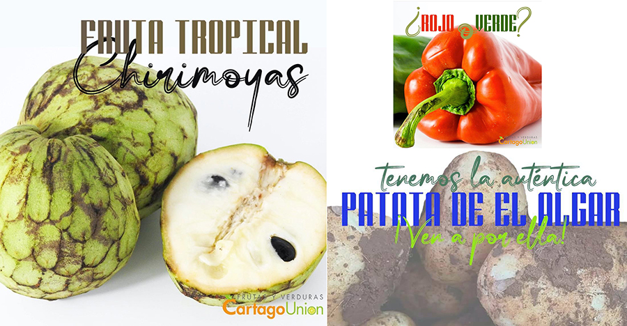 La chirimoya tiene propiedades digestivas, un alto contenido en fibra y ayuda al incremento de la energía celular. ¿Lo sabías? ¡Ven a por la tuyas, qué pronto se acaban! También puedes encargarla en el teléfono 968 08 68 86. También tenemos la auténtica patata de El Algar y la mejor fruta y verdura para tu mesa. Recuerda que nuestros dos establecimientos están en los números 88 y 118 de la calle Mayor de La Unión.