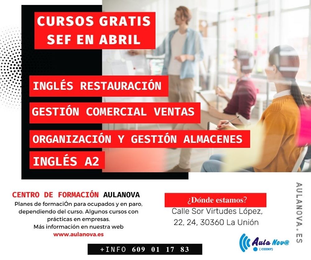 La academia de formación de la calle Sor Virtudes de La Unión oferta para este mes curso de 'gestión comercial de ventas', 'actividades de gestión administrativa', 'Inglés restauración', 'Inglés A2' y 'Ofimática', todos de gran interés para la búsqueda de empleo.