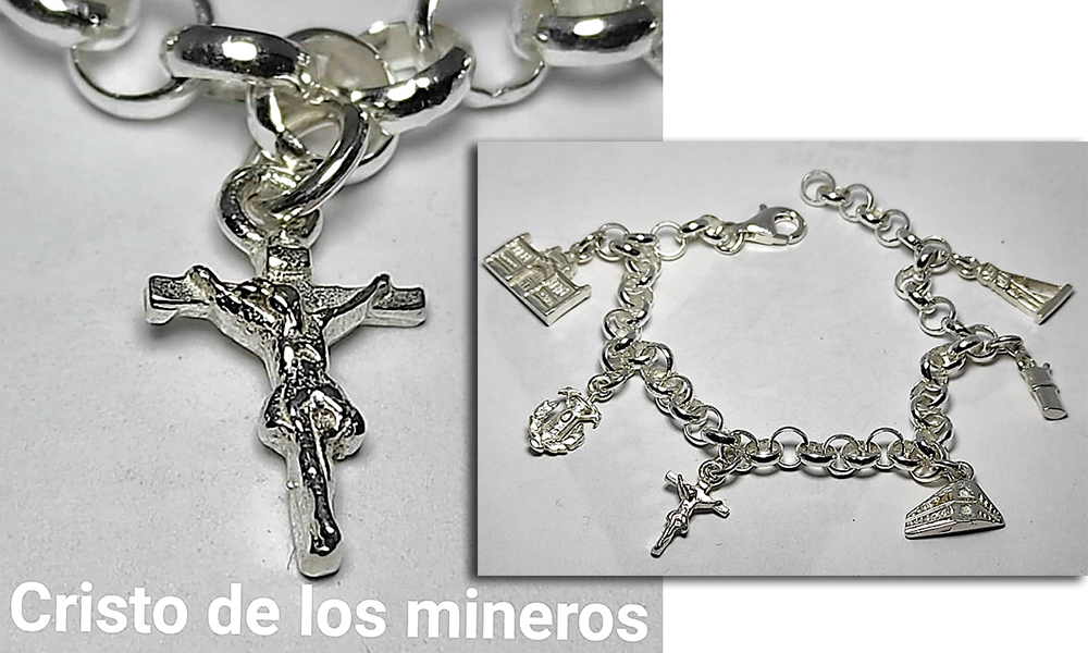 Manolo García Joyero, establecimiento ubicado en Santa Lucía, te ofrece una pulsera en plata de ley con colgantes del Cristo de los Mineros junto con la Casa del Piñon, el Mercado Público, un castillete minero, un carburo, la ‘Lámpara minera’ del Festival del Cante de las Minas y una lámpara minera. El precio es sólo de 45 euros, variando según la longitud de la pulsera. No esperes y haz tu pedido a través del número de teléfono 645 971 425, preferiblemente por WhatsApp.