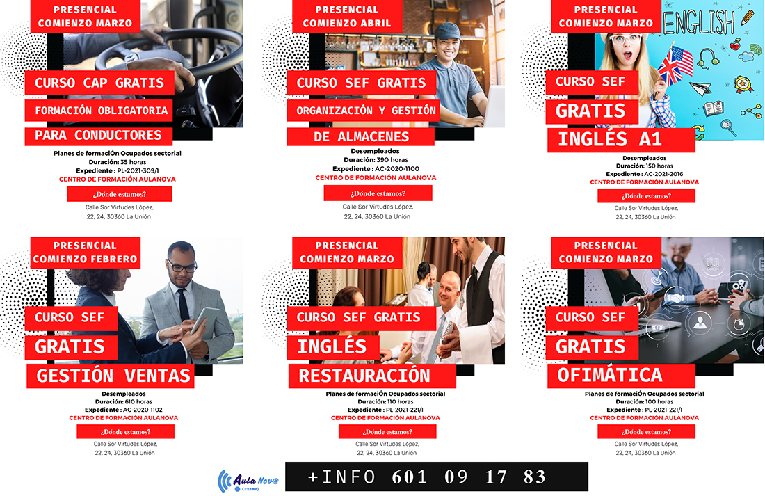 ◾ 𝐂urso gratuito CAP, formación contínua obligatoria para conductores ◾ Curso gratuito de ofimática ◾ Curso gratuito de Inglés A1 ◾ Curso gratuito de Inglés Restauración ◾ Curso gratuito de Gestión Comercial de Ventas con certificado de profesionalidad con prácticas en empresas. Opción de un becario con prácticas de 3 meses pagadas