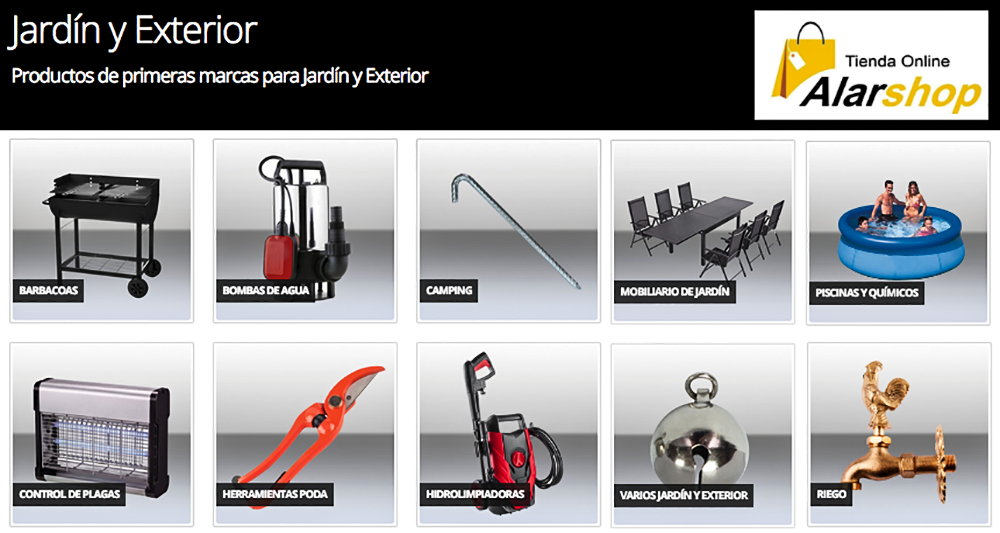 Compra desde casa como si estuvieras en un centro comercial. Es AlarShop, la forma más cómoda y barata de encontrar lo que necesitas. Cada semana lanzamos ofertas puntuales que no puede desaprovechar. En la actual, para que vayan preparando la llegada de la primavera, hemos 'encogido' a lo grande los precios de los productos relacionados con jardín y exterior (pinchar aquí). La imagen superior es sólo una muestra, pues hay mucho más.