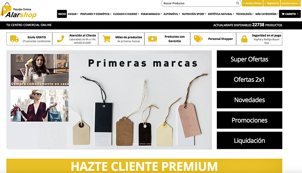 AlarShop, tu centro comercial virtual, te lo hace posible. Por sólo 60 euros al año te convertirás en 'Cliente Premium', pudiendo efectuar tus compras al mejor precio posible (inferior al que aparece en nuestras ofertas). Mientras te lo piensas, no dejes de entrar en nuestra atienda online, pues hemos prolongado el 'Black Friday', tenemos en súperpromoción los productos navideños y ampliamos la lista del 2x1.