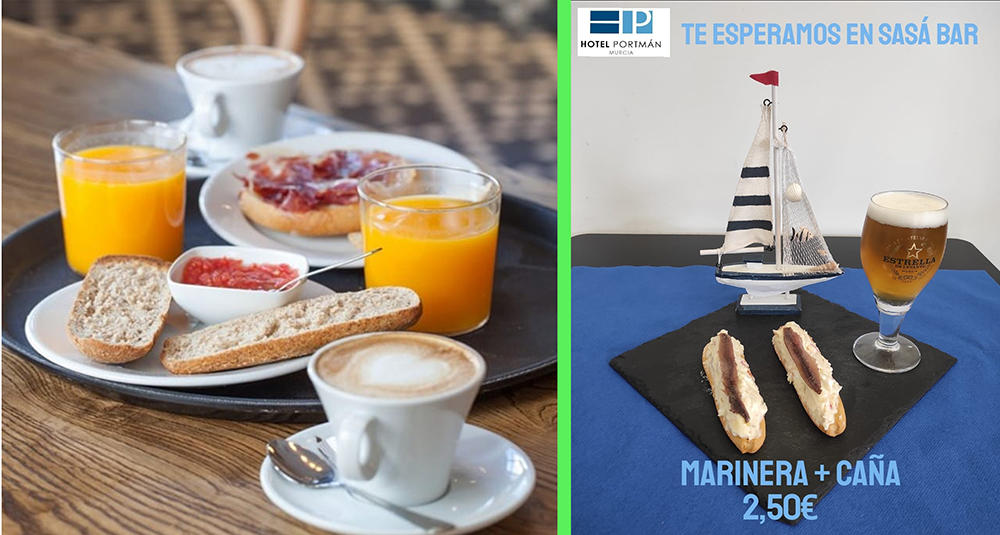 Ven y disfruta de nuestros manjares gastronómicos aunque no estés alojado en nuestras instalaciones. Estamos en el Hotel Portmán con terraza. Si quieres reservar, nuestro teléfono es 68 92 81 11. También arrancar el día con un magnífico desayuno mirando al mar o te puedes tomar una tapa con caña por sólo dos euros y medio. ¿Y qué te parece una merienda con café y tarta de zanahoria, chocolate o queso por sólo 4 euros? Los miércoles aprovéchate de nuestros 3x2.