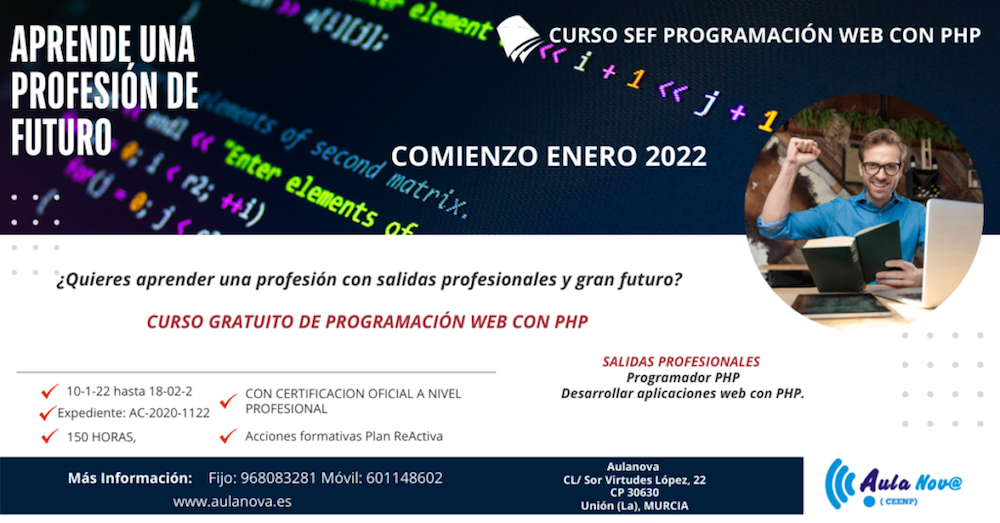 En tu academia de La Unión no hacemos 'Black Friday' porque más económico es imposible, como sucede con el curso del SEF que sale en enero con muchas salidas profesionales, ya que es una profesión muy demandada y bien pagada hoy. Se trata del curso gratuito de programación Web con PHP del plan 'Re Activa'.