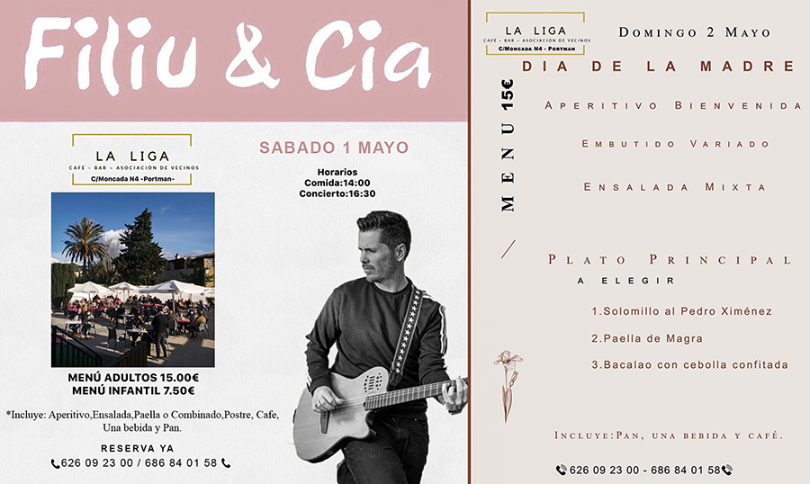 El café-bar de la Asociación de Vecinos de Portmán trae nuevamente a Filiu, junto a Julito Segura, para el sábado uno de mayo, aderezando su presencia con dos menús para la ocasión. Al día siguiente, qué mejor que festejar el ‘Día de la madre’ con un menú de 15 euros con aperitivo, embutido variado, ensalada mixta, plato principal (a elegir entre tres opciones), pan, bebida y café. ¡Reserva ya!