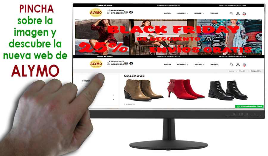 Tu tienda de zapatería y complementos de La Unión ya la tienes también en tu dispositivos electrónicos y a un sólo clic a través de Alymo.es (https://alymo.es/). Se estrena mientras tenemos un 'Black Friday' a tope con un 25% de descuento en los productos, una promoción que finaliza hoy. GALERÍA DE IMÁGENES (pinchar aquí)