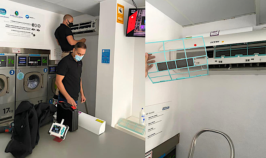 La empresa unionense informa a sus clientes que ha instalado un sistema de luz ultravioleta germicida UVC en sus sistemas de climatización, eliminando así mas del 99% de bacterías, hongos y virus (incluido el Covid-19), mejorando la calidad del aire interior, puesto que el coronavirus está demostrado se transmite por aerosoles. En la imagen se observa el proceso de instalación en la sede de la lavandería autoservicio 'Quality Wash' de la calle Mata de La Unión.