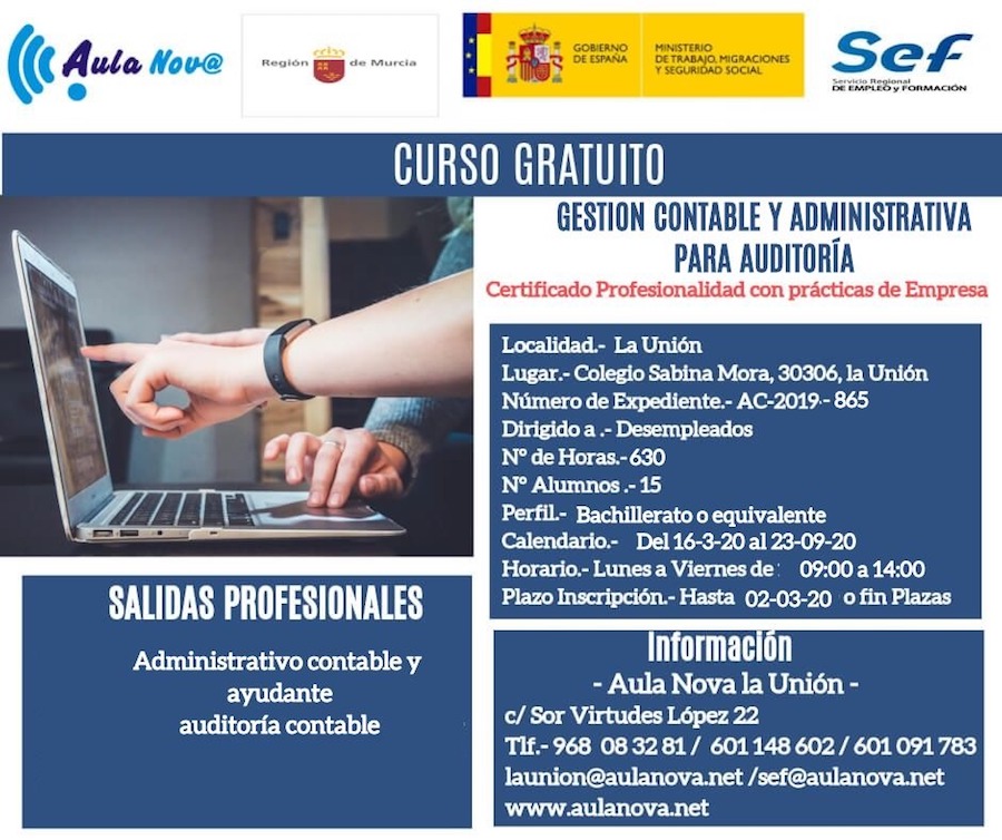 'Gestión contable y gestión administrativa para auditoría' y 'Actividades Administrativa en relación con el cliente' son los dos nuevos cursos que el Servicio Regional de Empleo y Formación ha concedido al centro de formación de La Unión con importantes salidas laborales. Debido a la situación generada por el coronavirus, las fechas para su celebración se retrasarán, pero se puede efectuar ahora la inscripción.