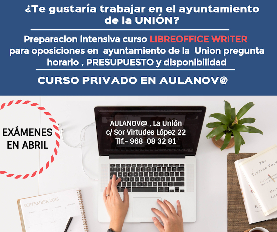 Aula Nova te ofrece un curso privado de preparación intensiva curso ‘Libreoffice Writer’ para oposiciones al consistorio unionense, cuyos exámenes serán dentro de dos meses.