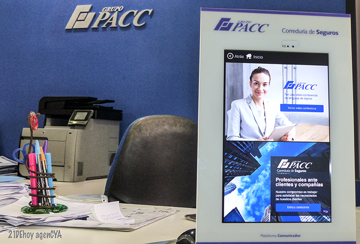 La oficina de la aseguradora situada en la calle Mayor ha instalado un equipo de videollamada que conecta a la persona con problemas de audición con el 'Call Center' de la compañía, donde en tiempo real puede mantener una conversación personalizada de gestos para resolver todas sus dudas sobre cualquier póliza en la que esté interesado.