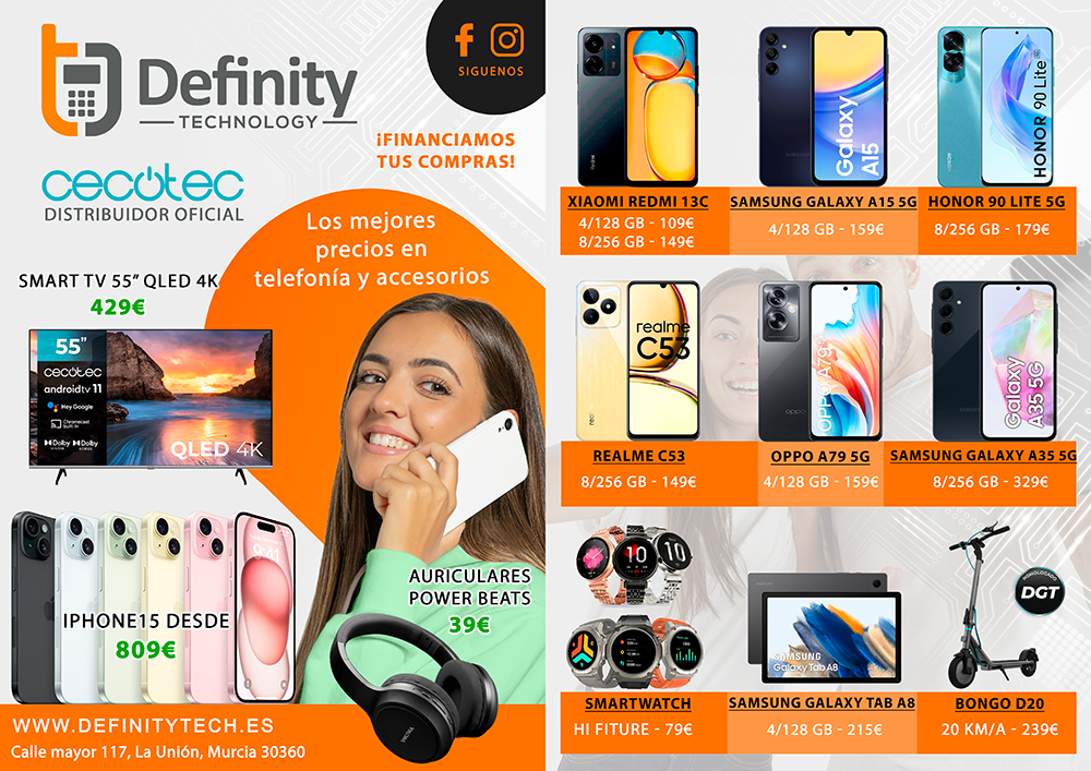 Teléfonos móviles, relojes, tabletas, auriculares, televisores... y a los mejores precios. Aprovecha esta oportunidad a través de nuestra web o de la tienda física en el numero 117 de la calle Mayor de La Unión. También podemos financiarte las compras.