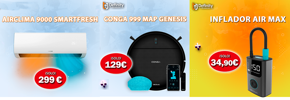 Un equipo de aire acondicionado por sólo 299 euros o un inflador de calidad pese a su escaso tamaño por sólo 34,90 euros. Son las ofertas de esta semana que lanza Definity, a las que se suma lo mejor y más barato para la limpieza del suelo: un Conga por 129 euros.