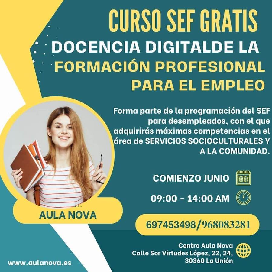 Desde Aula Nova nos gustaría informarte acerca de una acción formativa que pensamos se ajusta a tu itinerario formativo-profesional, ampliando así tu formación continua y mejorando tus opciones de inserción en el mundo laboral. Forma parte de la programación del SEF (Servicio de Empleo y Formación) para desempleados, con el que adquirirás máximas competencias en el área de 'Servicios socioculturales y a la comunidad'.