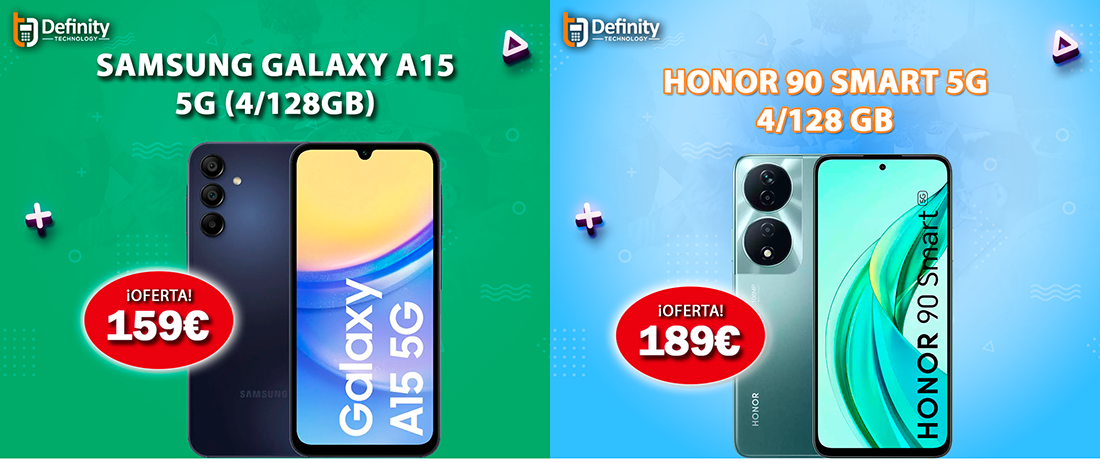 Un terminal 'Samsung Galaxy A15 5G' por sólo 159 euros y un terminal 'Honor 90 Smart 5G' por 189 euros. Son las dos promociones que lanza Definity Technology hasta el domingo. También se pueden financiar hasta en tres meses sin pagar intereses. Si quieres más información o adquirir alguno de ellos, puedes dirigirte a la tienda física situada en la calle Mayor de La Unión o en la página web www.definitytech.es