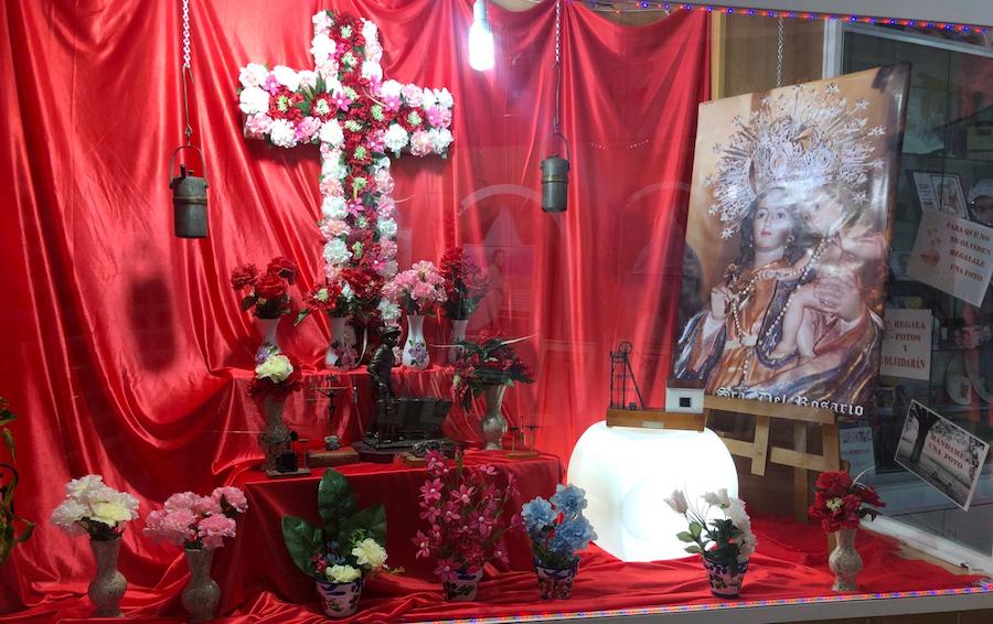 Jayam Fotografía se distingue por ser uno de los comercios del municipio que más trabaja el escaparatismo, adaptándose siempre a los grandes eventos de esta tierra. Este mes toca la cruz de mayo, que ha sido montada con flores de variados colores en un altar adornado con carburos y enriquecido con la imagen de la patrona de La Unión.